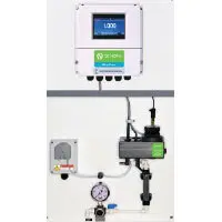 The amperometric based three electrode measure cell is designed to continuously analyze free or total chlorine over the range of 0-20 mg/L. The measure cell is panel mounted and comes complete with a built-in pressure reducing valve to control sample inlet pressures up to 150 psi. A flow switch is included to alert the user in case of sample flow failure. A third electrode is utilized in the CL1 measure cell to further bias and stabilize the chlorine readings. Reagents are fed by a peristaltic pump assembly for up to a maximum 5 week supply of reagent(s). Water sample temperatures are measured, displayed and